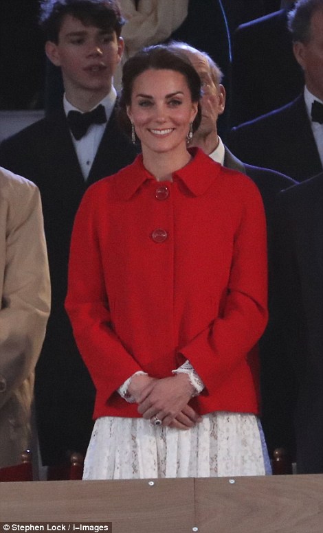 The Queen and Duke of Edinburgh arrived at the celebrations in the Scottish State Coach, and were greeted by the Prince of Wales and the Duchess of Cornwall upon arrival. They joined the other members of the family and guests in the Royal Box.