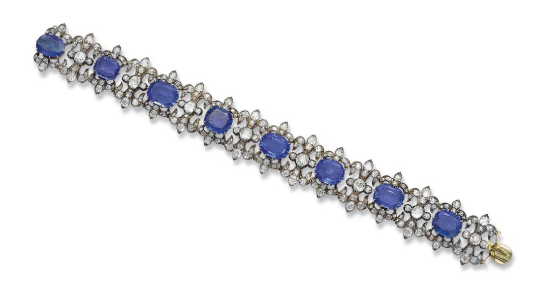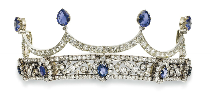 A sapphire and diamond tiara designed as an openwork scrolling bandeau, set with old-cut diamonds, applied with five sapphire and diamond graduated clusters, set with old-cut diamonds and with pear-shaped sapphire accents. A sapphire and diamond bracelet designed as a continuous row of mirrored fleur de lys motifs, set with old and rose-cut diamonds, enhanced with eight cushion-shaped sapphires. A pair of sapphire and diamond brooches designed as an old and rose-cut diamond fleur de lys, centering an octagonal-cut sapphire. Originally described as “An historic sapphire and diamond suite made for the empress Marie Louise and lastly owned by the duchess of Habsburg-Lothringen”, when at auction in Christie’s London, 12 July 1961, the suite of sapphire and diamond jewelry is thought to have come from the collection of Empress Marie-Louise of France (1791-1847), second wife of Emperor Napoleon, who passed it down to her Habsburg relatives. In 1961, the suite was bought by German banker August von Finck in 1961, and appeared a auction in November 2012, as Property of a German Nobleman. The tiara and necklace were seen on the Duchess of Lorraine, a grandniece of emperor Franz Josef I of Austria.