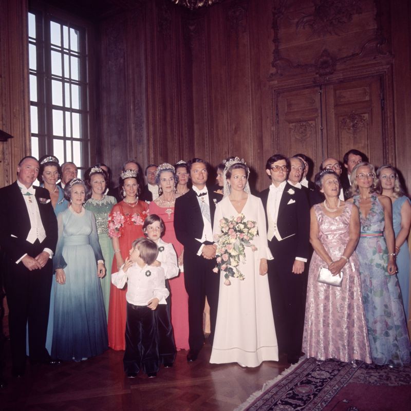 There were quite a few foreign royals in attendance, including Queen Ingrid of Denmark (aunt of the bride, wearing the Danish Ruby Parure), then Crown Princes Harald and Crown Princess Sonja (wearing Queen Josefina’s Diamond Tiara) of Norway, then Crown Princess Beatrix of the Netherlands (wearing Queen Emma’s Diamond Tiara), and Princess Benedikte of Denmark, and Princess of Sayn-Wittgenstein-Berleburg (cousin of the bride, wearing her Floral Tiara). Among the family members were the bride’s sisters; Princess Margretha (wearing her Aquamarine Tiara), Princess Brigitta (wearing the Four Button Tiara), and Princess Desiree (wearing her personal Tiara). Also present were Prince Bertil of Sweden (uncle of the bride) and the then Lilian Craig (Bertil’s longtime partner and eventual wife, wearing her Laurel Wreath Tiara).
