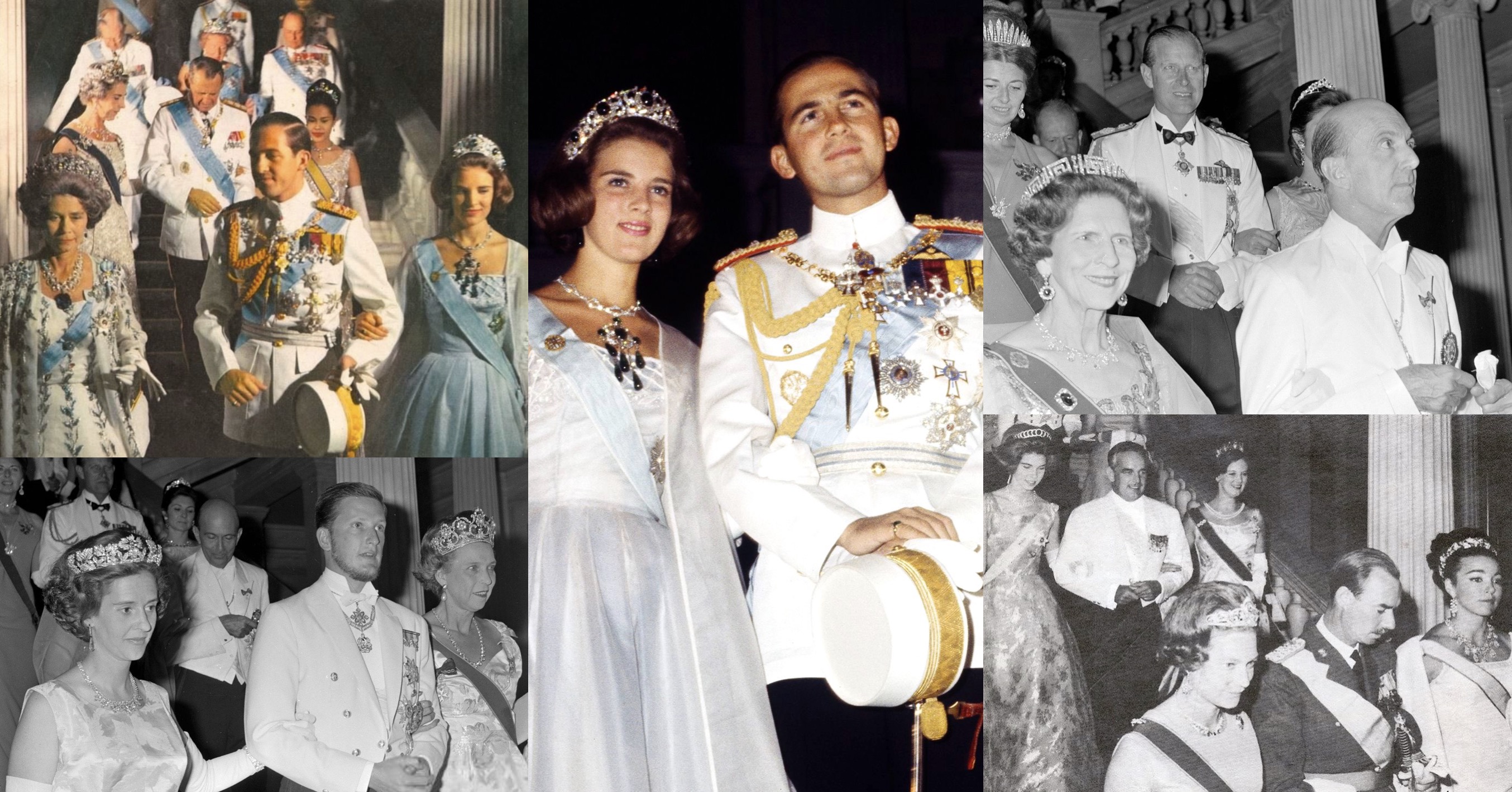 King Constantine II of Greece (in the Order of the Redeemer, Order of Dannebrog, Order of Saints George and Constantine, and the Commemorative Badge of the Centenary of the Royal House of Greece) and Princess Anne Marie of Denmark (wearing the Greek Emerald Parure, the Order of the Redeemer, and the Order of Saints Olga and Sophia with the Commemorative Badge of the Centenary of the Royal House of Greece).