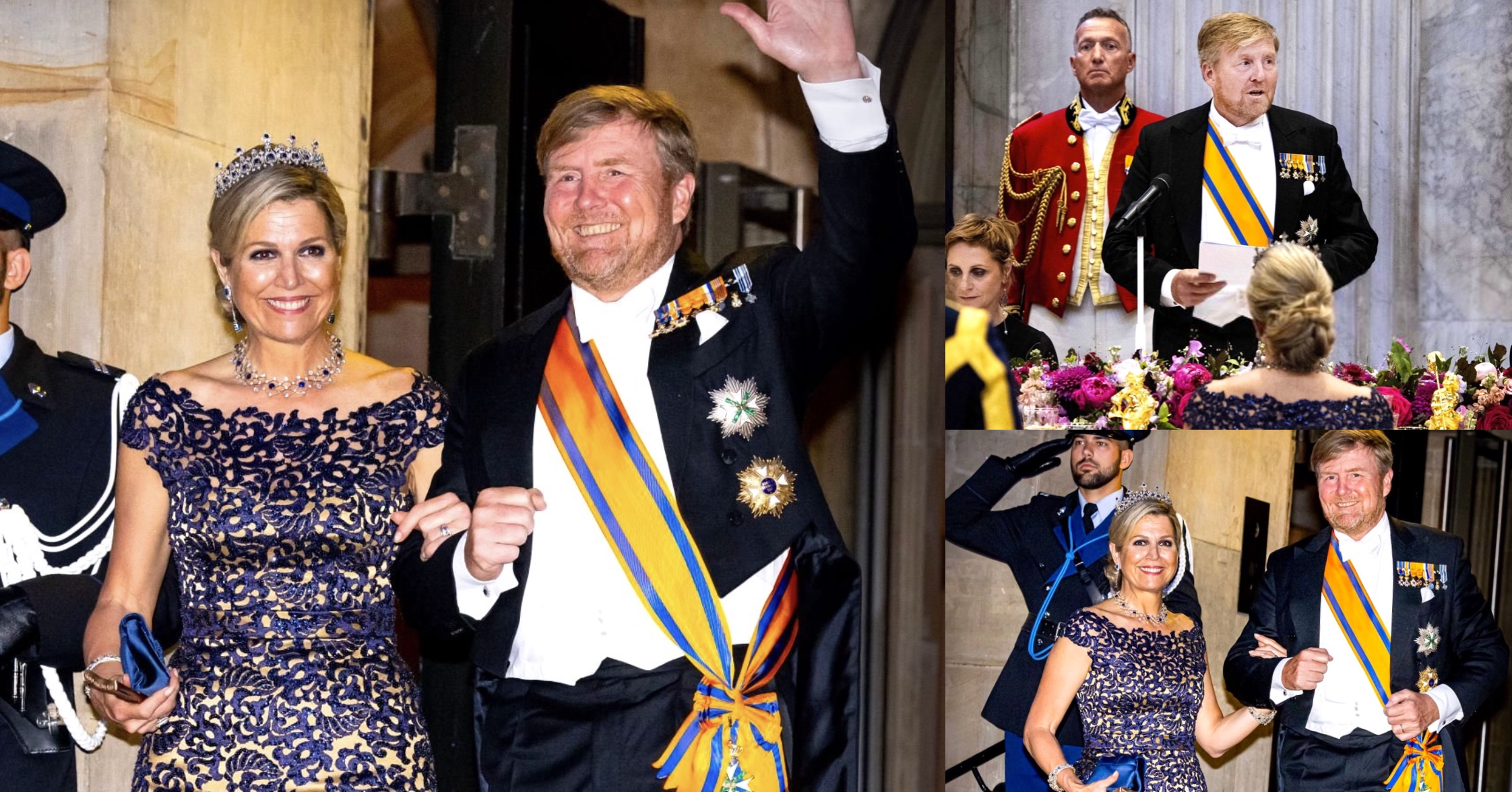 King Willem-Alexander wore White Tie with the Sash and Star of the Military William Order and the Star of the Order of the Netherlands Lion. Queen Máxima wore a repeated Claes Iversen gown with the Sapphire Necklace Tiara and Queen Wilhelmina’s Diamond Trellis Necklace.