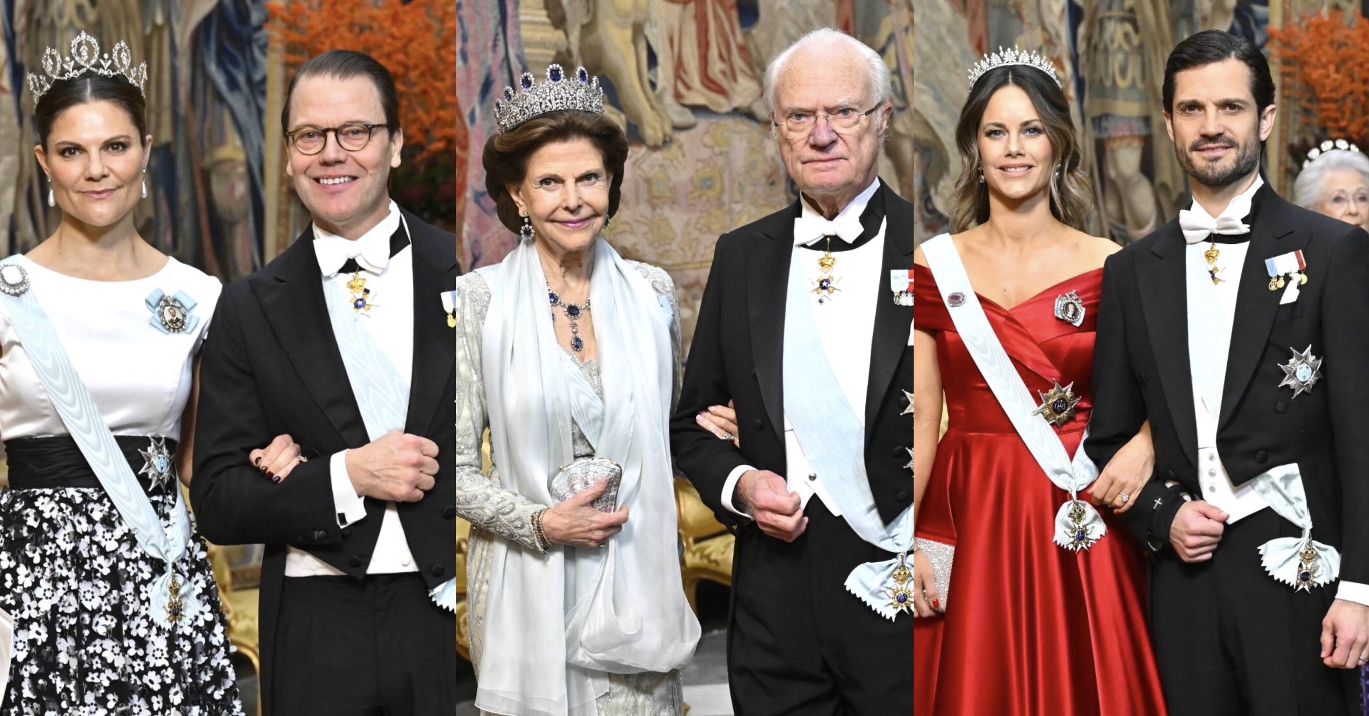 King Carl XVI Gustav wore White Tie with the Sash and Star of the Order of the Seraphim and the Neck Badge of the Order of the Polar Star. Queen Silvia wore her gown from Princess Madeleine’s Wedding with Leuchtenberg Sapphire Parure, the Sash and Star of the Order of the Seraphim, and King Carl Gustaf’s Portrait Brooch.