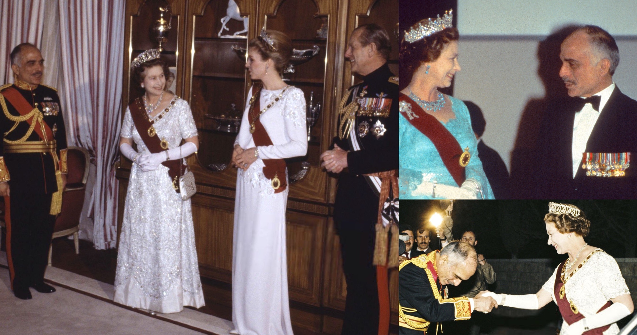 In the evening, King Hussein (wearing the Order of the Bath) and Queen Noor (in her Diamond Tiara and the Order of Al-Hussein bin Ali) hosted a State Banquet for the Queen (wearing the Vladimir Tiara and the Order of Al-Hussein bin Ali) and Duke of Edinburgh (in the Supreme Order of the Renaissance) at the Raghadan Palace in Amman.