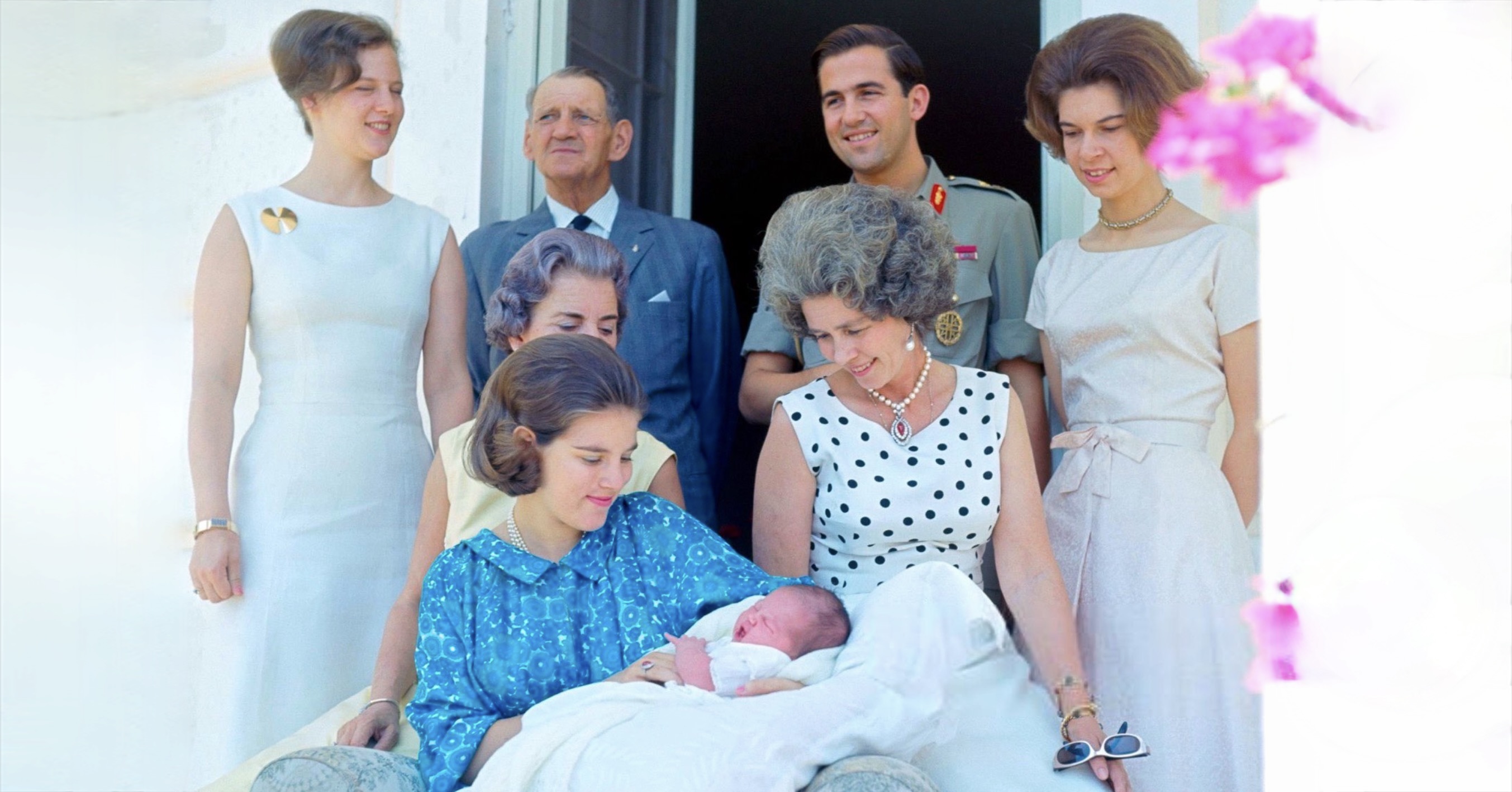 King Frederik IX, Queen Ingrid, and Crown Princess Margrethe of Denmark joined the Greek Royal Family for a photo call at the Villa Mon Repos in Corfu, as they presented Princess Alexia to the press and public.