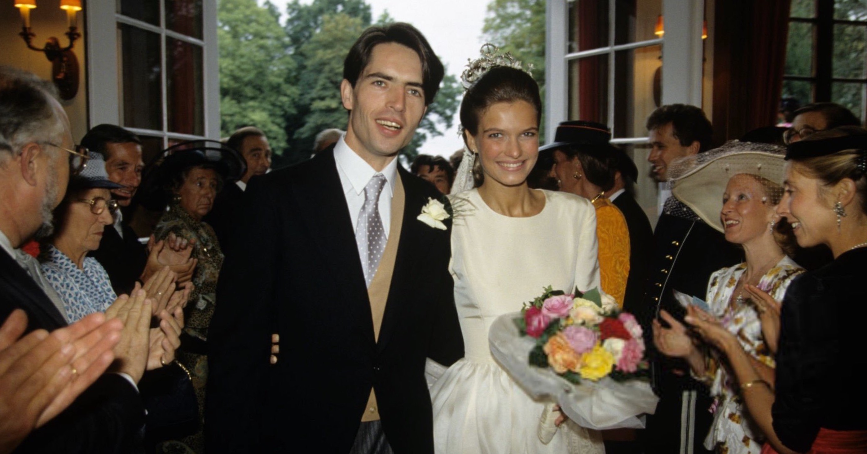 The Countess of Paris led Royal and Noble Guests and Relatives to celebrate the Wedding of her grandson, Count Thierry de Limburg Stirum, and Katia della Faille de Leverghem in Belgium on this day in 1990, 35 years ago.