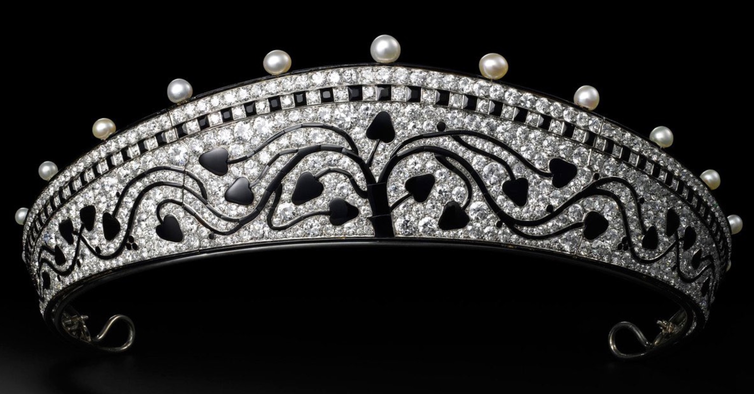 The striking Diamond Kokoshnik Tiara is pave-set with diamonds and an onyx ‘Tree of Life’, topped with Pearls, which was created by Cartier in Paris in 1914.