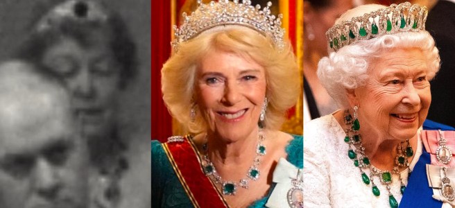 While most eyes were on the Princess of Wales wearing Queen Victoria’s Oriental Circlet Tiara at the German State Banquet at Windsor Castle, Queen Camilla also debuted a magnificent heirloom that has only been worn once before in over eight decades, by the late Queen for her last Gala Appearance; the Greville Emerald Necklace!